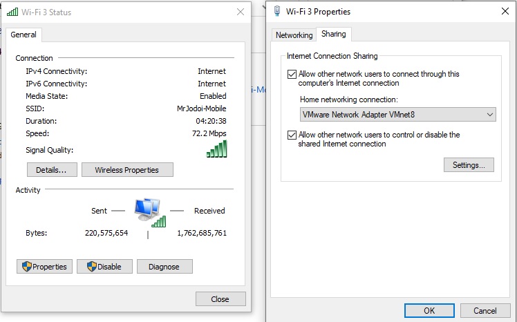 Windows ต้องทำการ Share Internet มาที่ VMNet8 ก่อนด้งรูปด้านล่าง