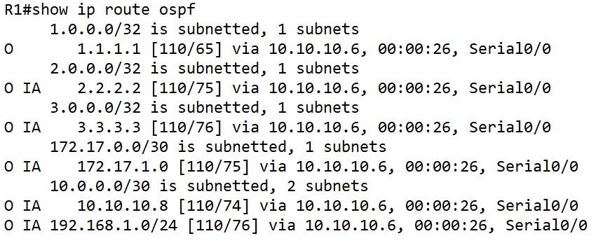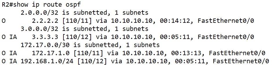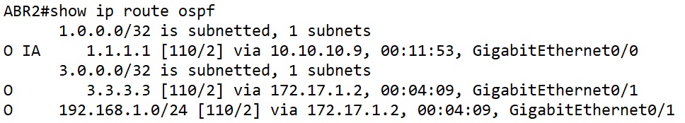 ตรวจสอบ Routing Table ของ Router ABR2 จะได้ตามด้านล่าง